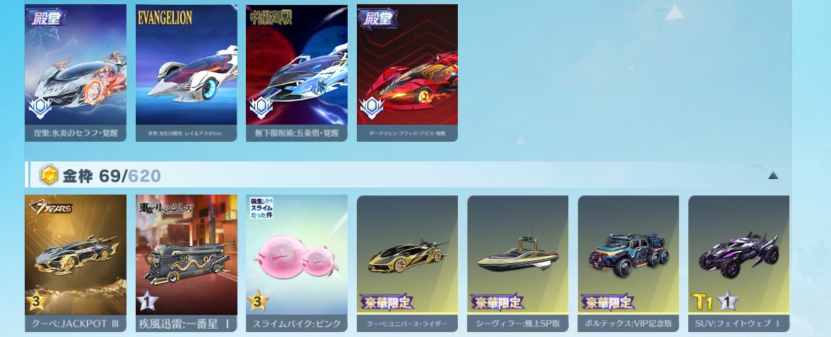 iOS版 殿堂車(世界:双生の闇光レイ&アスカVer)・殿堂車(無下限呪術:五条悟・覚醒)など殿堂7種所持