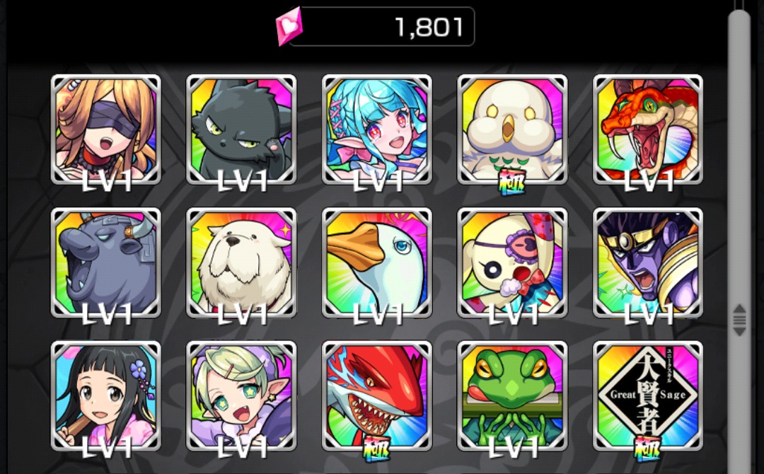 | ガチャ限定モンスター所持数 | 1010体以上 |