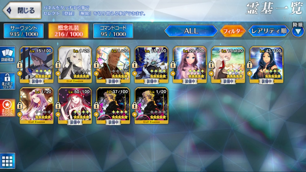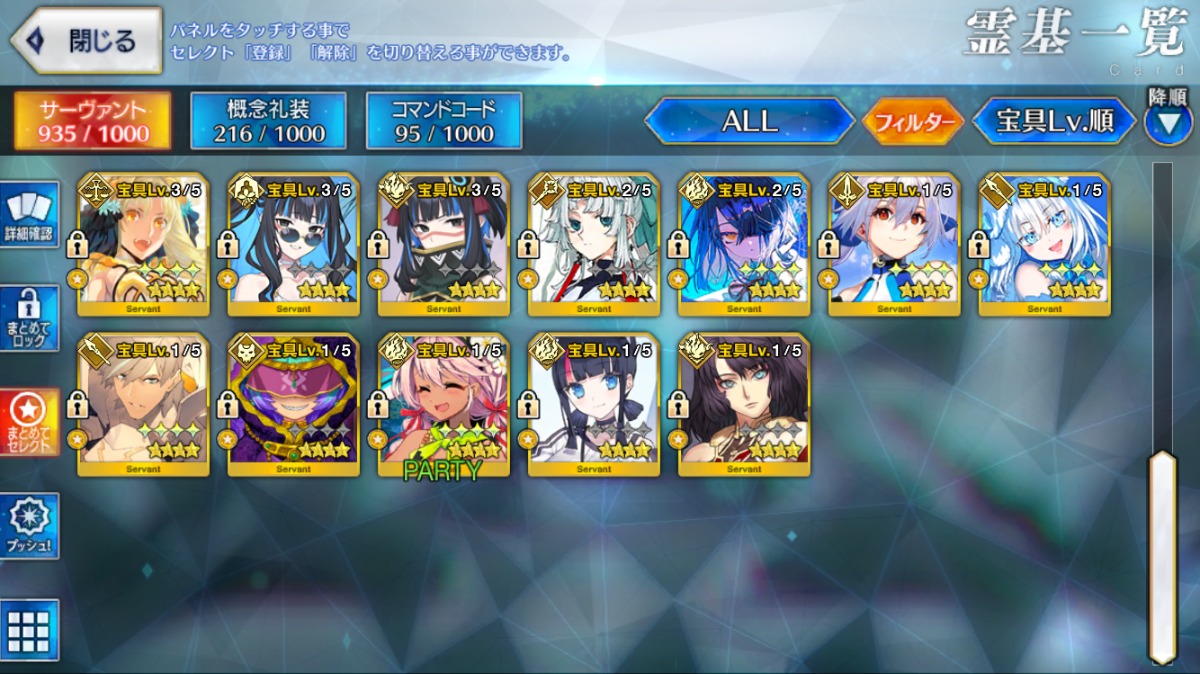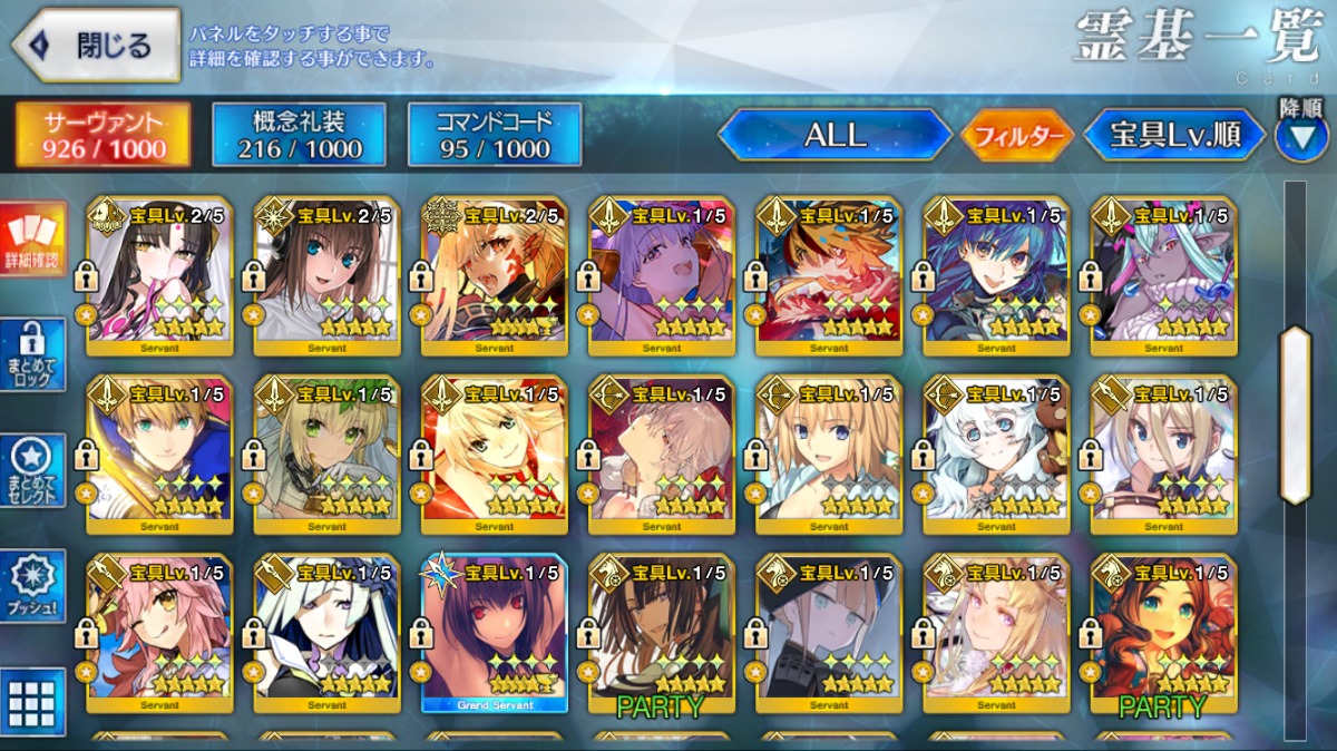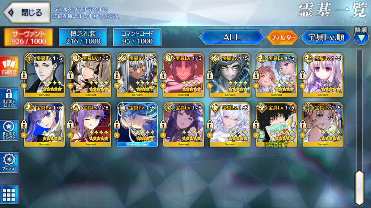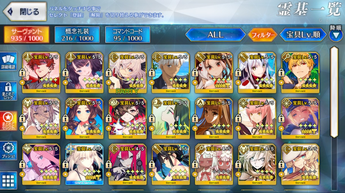 アルクェイド宝具5:Lv120・玉兎宝具3・水着ティアマト宝具2など所持