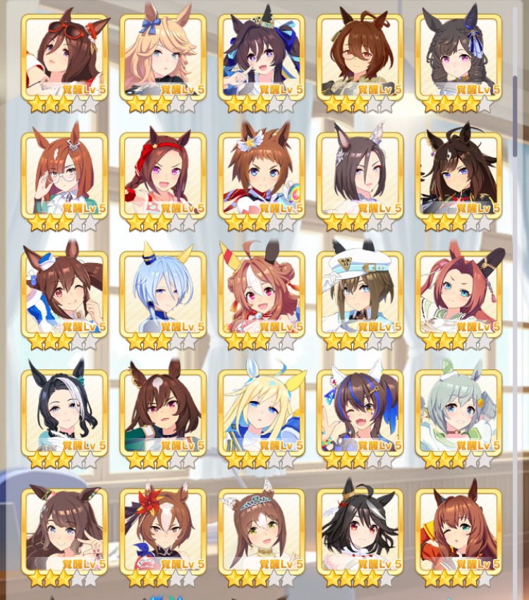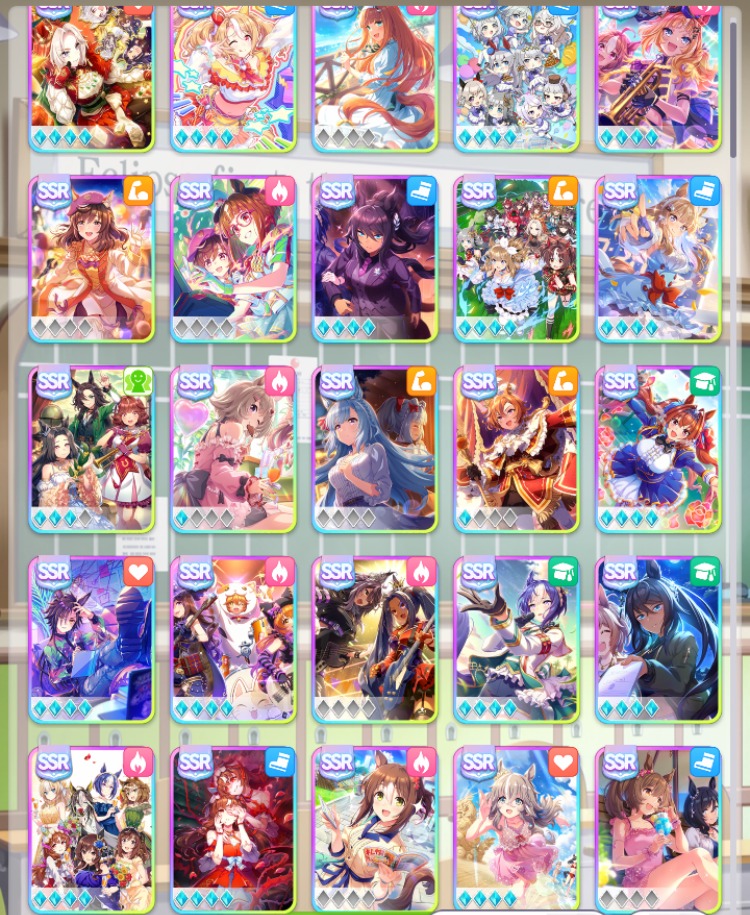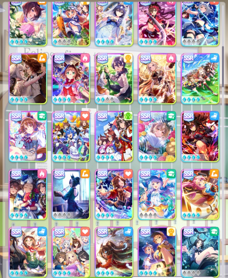 SSR完凸アーモンドアイ・SSR完凸ダイワスカーレット(賢さ)・SSR完凸エアシャカールなど所持(虹の解放結晶1個)